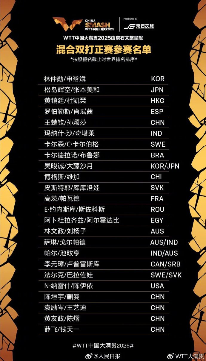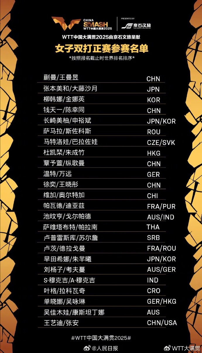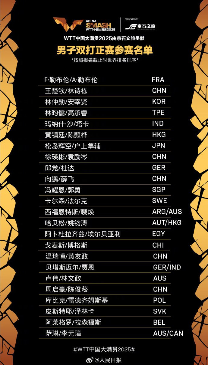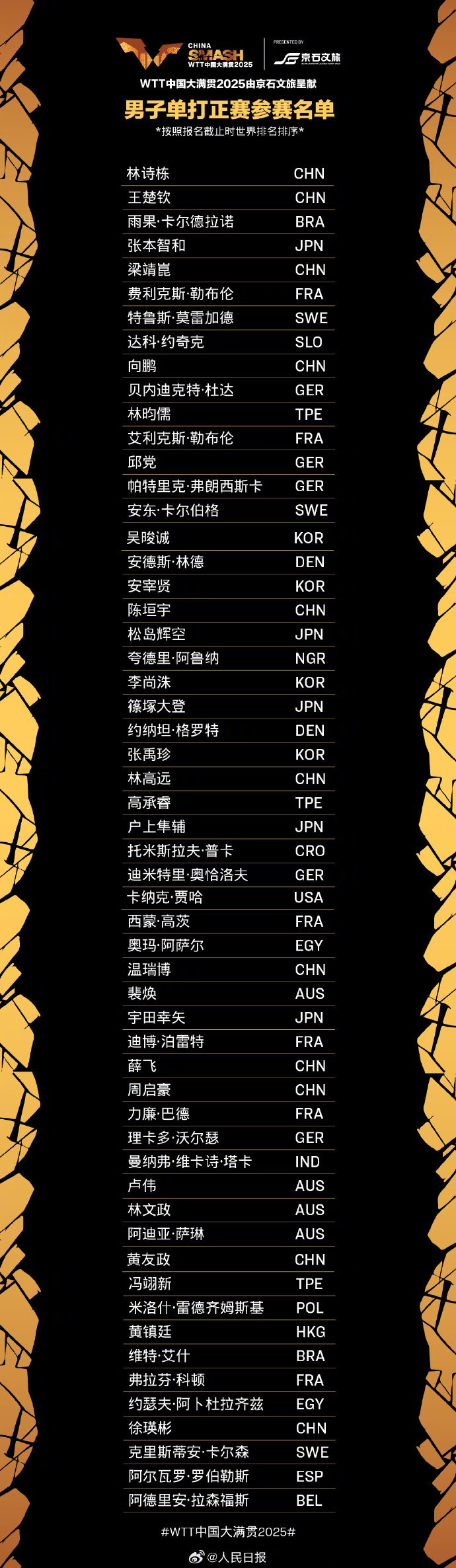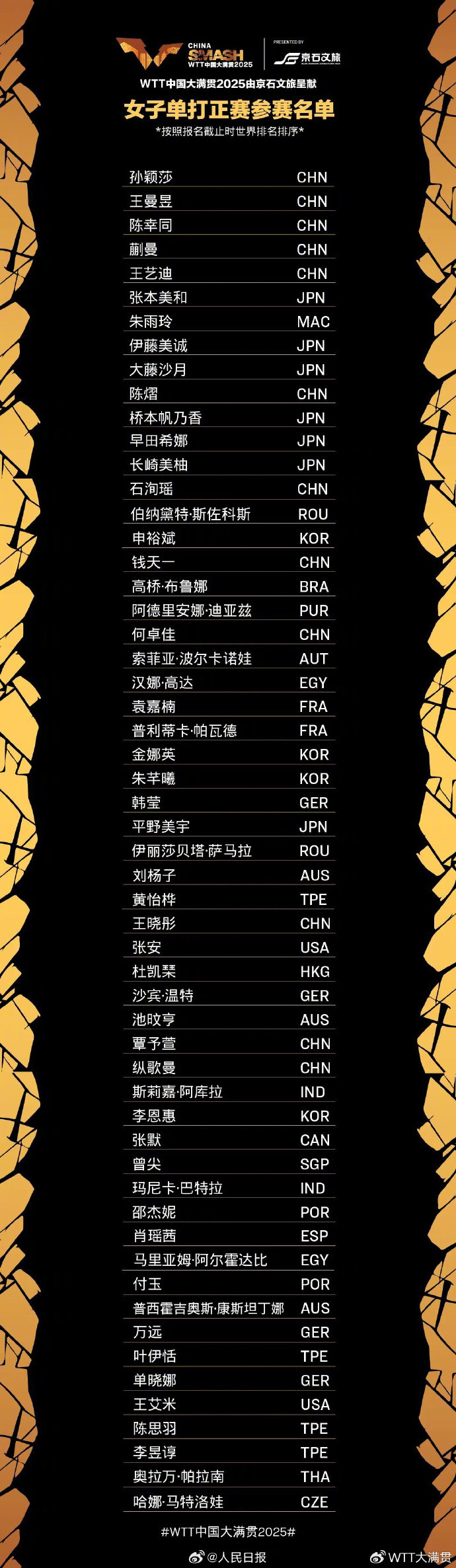 [转发期待!#王楚钦孙颖莎等中国大满贯见#]#WTT中国大满贯参赛全阵容名单#WTT中国大满贯2025正赛将于9月28日在北京打响全国十大配资,正赛抽签仪式将于9月26日下午举行。男、女单打正赛还有8个席位将通过9月25日至27日进行的资格赛决出。(WTT世界乒联)#长沙提供超1.4万个令人心动的offer#