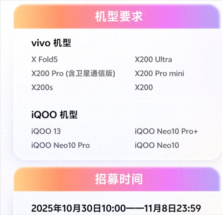 这波 10 款机型覆盖得很激进——X Fold5 这种折叠旗舰、X200 Pro 系列、X200s 轻旗舰,再到 iQOO 13、Neo10 Pro+ 这些性能猛兽,都被拉了进来。