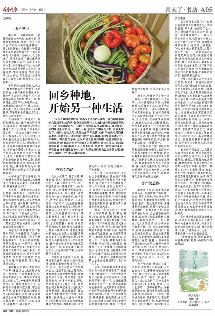 “大不了就回老家种地”是不少上班族内心深处一次次暗潮涌动却只能耽于幻想的梦。曾为城市职场打工人的钟敏和缪睫却想干就干,先后选择离城返乡,一起在江西赣南农村辛勤耕耘,自食其力。他们建设生态农场——雨后大地,坚持不使用农药化肥,与病虫害共存,与野生动物共处,勇敢抗击干旱洪涝,让脚下的大地得以休养生息,丰饶肥沃,以强韧的自然力量抵御环境的变化莫测。在十年躬耕山野的苦与乐中,这对年轻人曾满怀期待,也曾步履沉重。缪睫在新书《雨后大地》中记录下归园田居的成长与得失,她深深地意识到:逃离职场并不是人生的终点,而是另一种生活的开始,不管是在城市还是在乡村,每个人都必须找到自己生命的土壤,保护它,浇灌它,令它肥沃,使它健康。