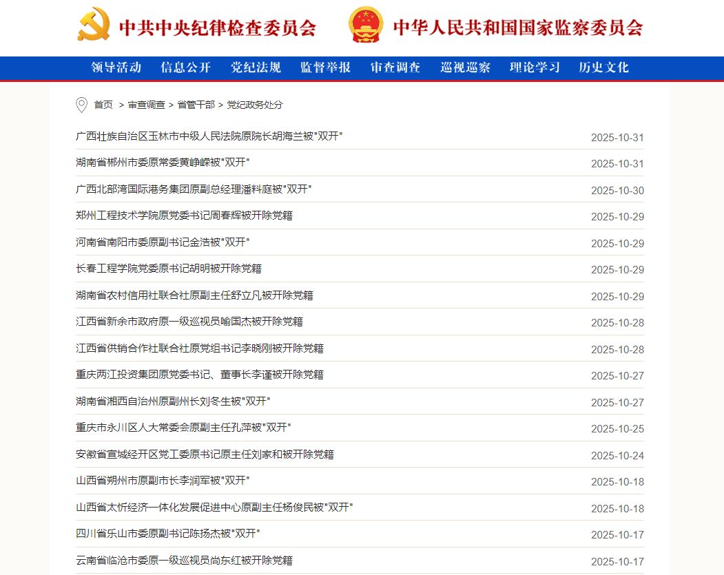 此外还有:广西壮族自治区玉林市中级人民法院原党组书记、院长胡海兰被开除党籍和公职,湖南省农村信用社联合社原党委委员、副主任舒立凡被开除党籍,重庆两江投资集团原党委书记、董事长李谨被开除党籍,大连海关原党委书记、关长刘大立被开除党籍和公职,中国中纺集团有限公司原党委书记、董事长刘云被开除党籍和公职,等等。