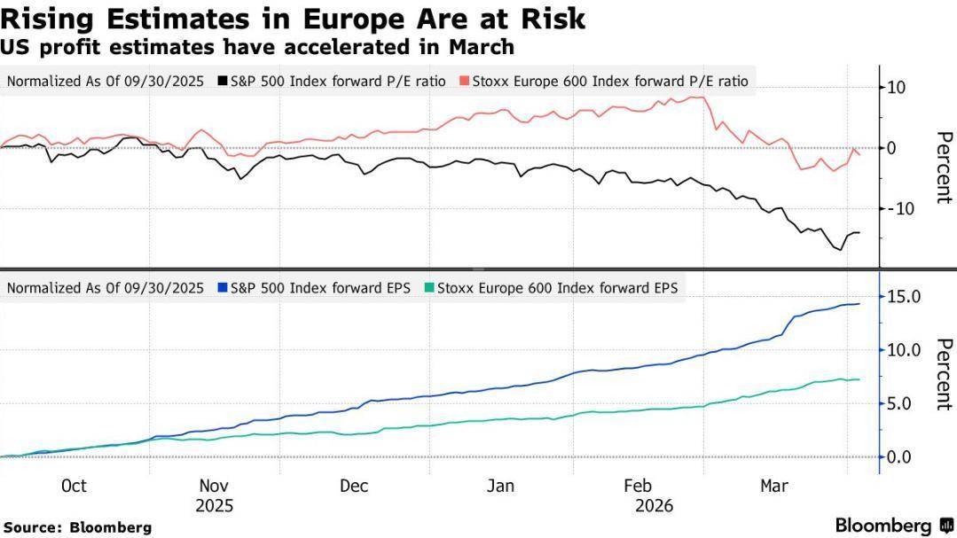 相比之下,同期欧洲斯托克600指数的同类指标则保持平稳。欧洲面临的部分问题在于盈利前景。此前,此前受财政支出扩张与低利率政策预期推动,盈利预期持续上行,但这些驱动因素已逐渐消退。